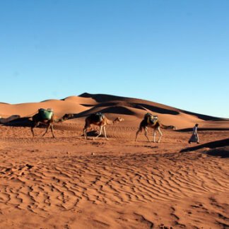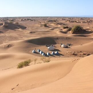 Rendez-vous à 8h à Ouarzazate (gare routière ou hôtel) Transfert en minibus via Taznakht vers la petite ville de Foum Zguid Pause déjeuner dans un restaurant local (inclus) Changement de véhicule : passage en 4×4 pour 3h de piste désertique Traversée du plateau d’Iriki, ancien lac salé asséché, territoire des fossiles et des anciennes pistes du Paris–Dakar Arrivée à l’Erg El Ghoul, campement dressé dans les dunes Accueil par l’équipe nomade, installation dans les tentes Coucher de soleil sur les crêtes Dîner au feu de bois, nuit sous tentes Distance totale : 320 km – dont 90 km de piste Altitude : 550 m